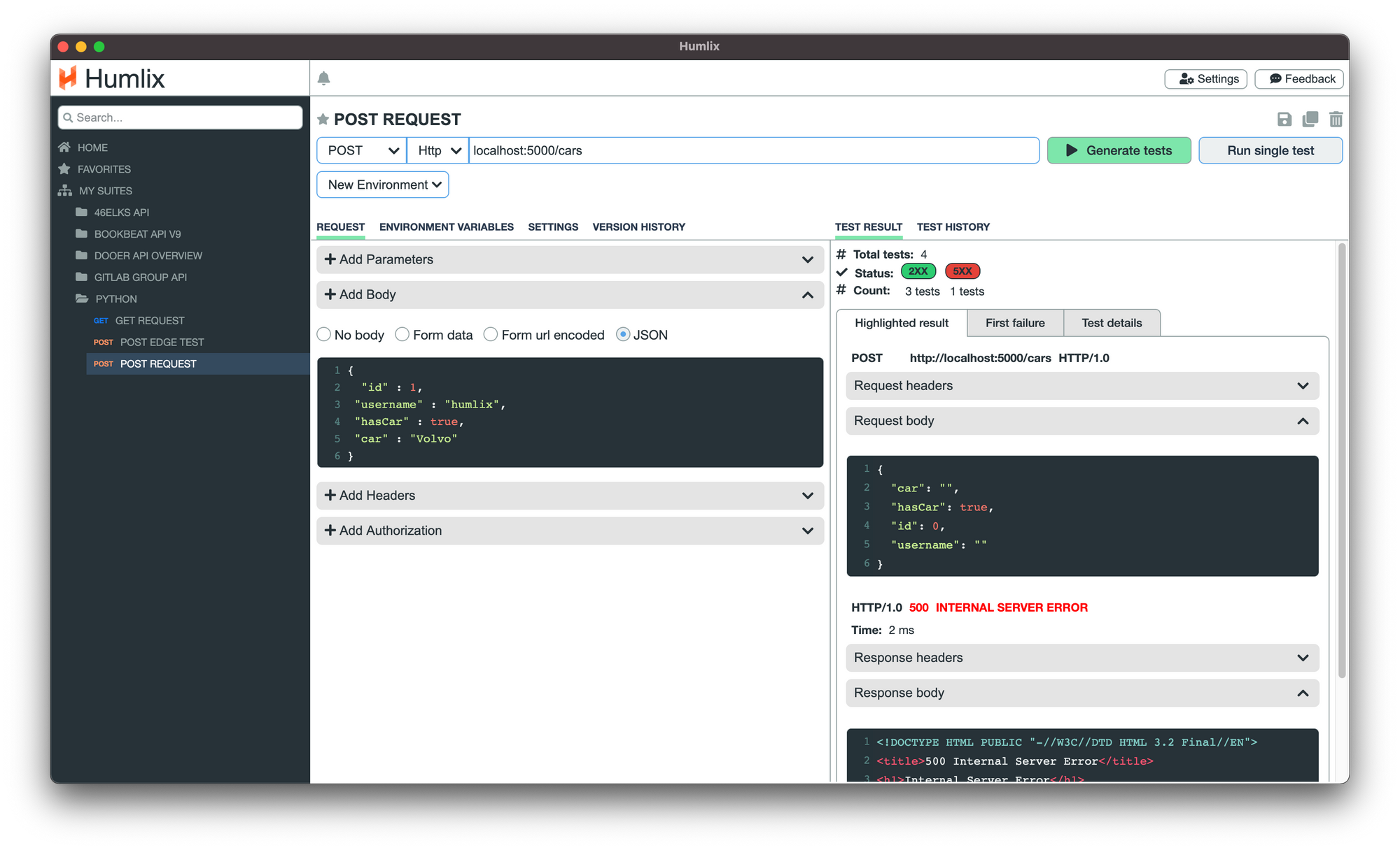 To complement our unit tests, we test the functionality with Humlix as well. In the picture below, Humlix shows that it only took four tests to get a 500 Internal Server Error.